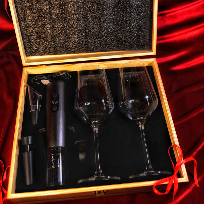Accesorii moderne: Tirbușon electric, aerator și set complet de accesorii pentru o servire impecabilă.