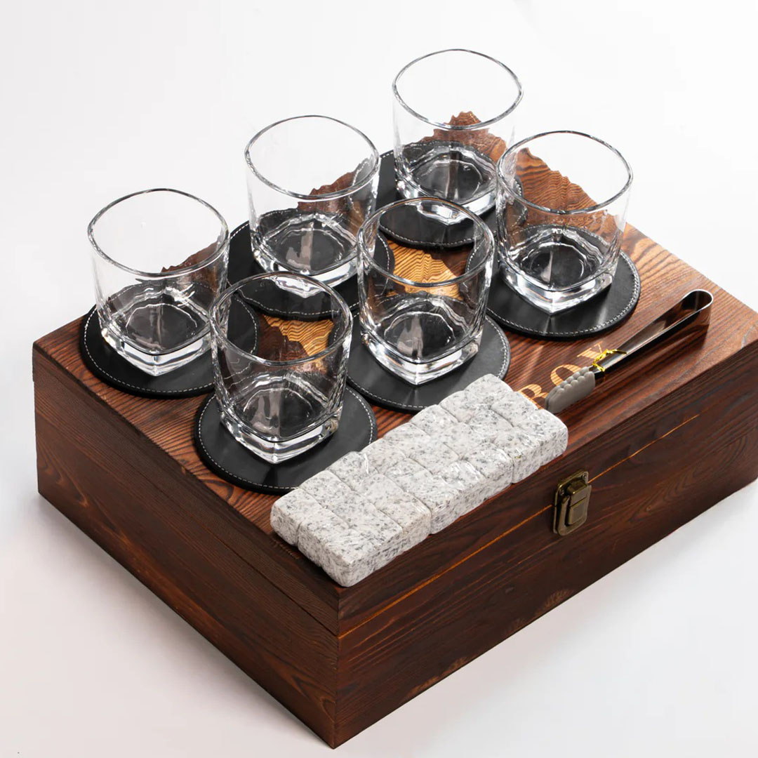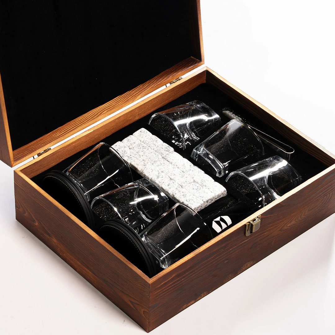 Inclus: • 6 pahare – suficiente pentru un grup. • 6 suporturi pentru pahare – pentru fiecare oaspete. • Clește – ușor de utilizat. • 24de pietre de răcire sunt suficiente. • Geantă de depozitare – comandați după seară.