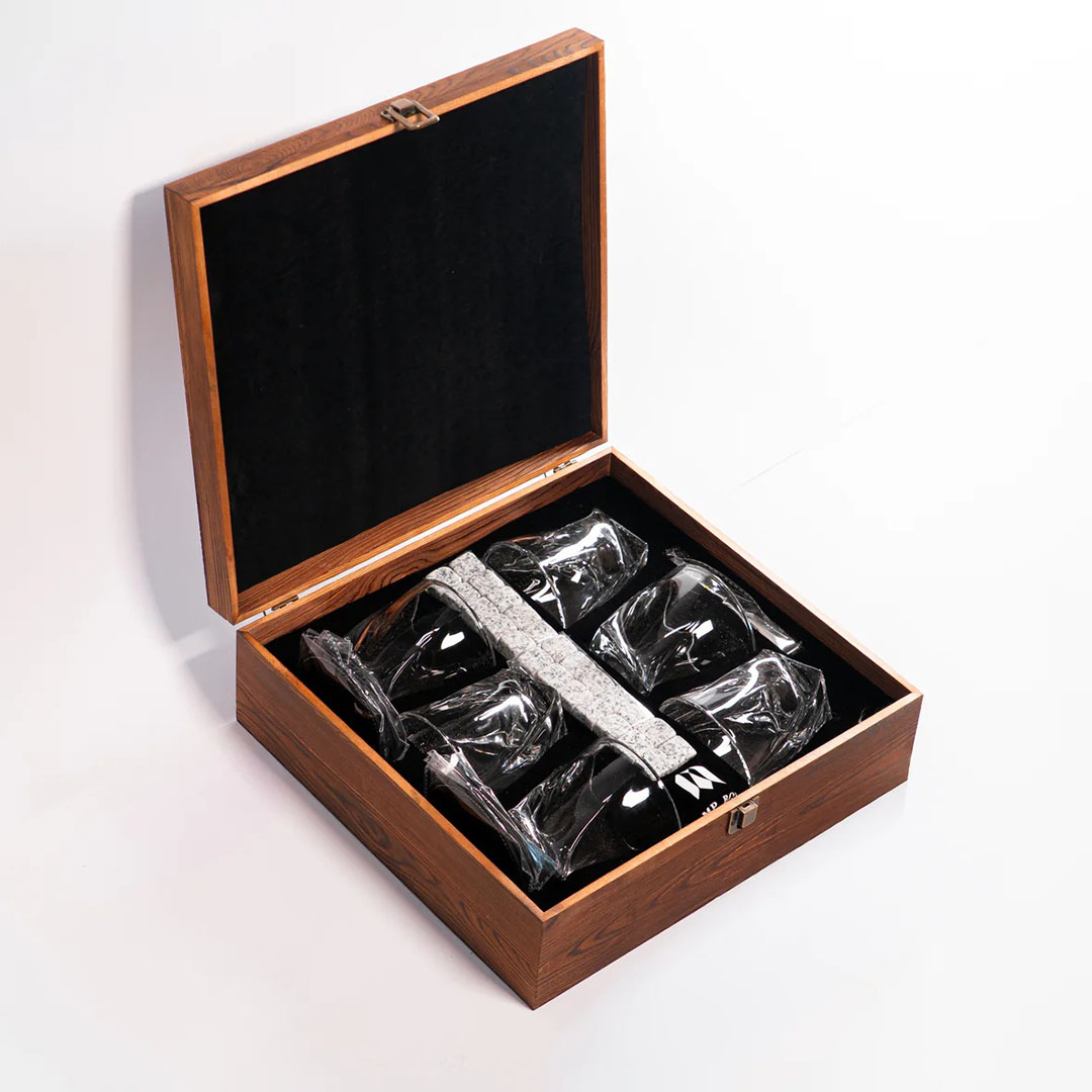 В комплекте:• 6 бокалов — хватит на компанию.• 6 подставок — для каждого гостя.• Щипцы — удобство в использовании.• 24 охлаждающих камней — достаточный запас.• Мешочек для хранения — порядок после вечера.
